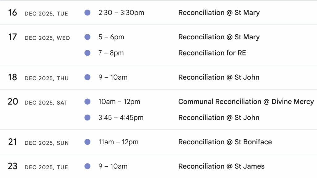 The following options are available for the Sacrament of Reconciliation. Each time is for one hour but may be shorter if all confessions have been received.